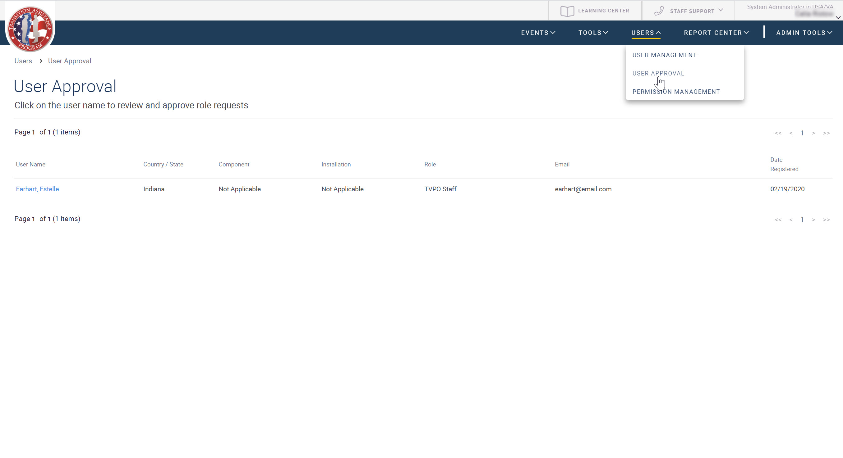 1. Access the User Approval page from the approval email you received in your inbox, or by hovering over USERS on the TAP EventPLUS menu bar, and clicking USER APPROVAL.